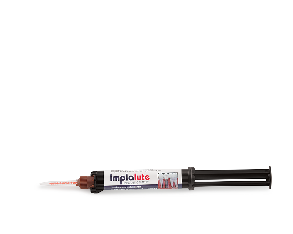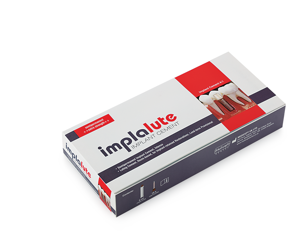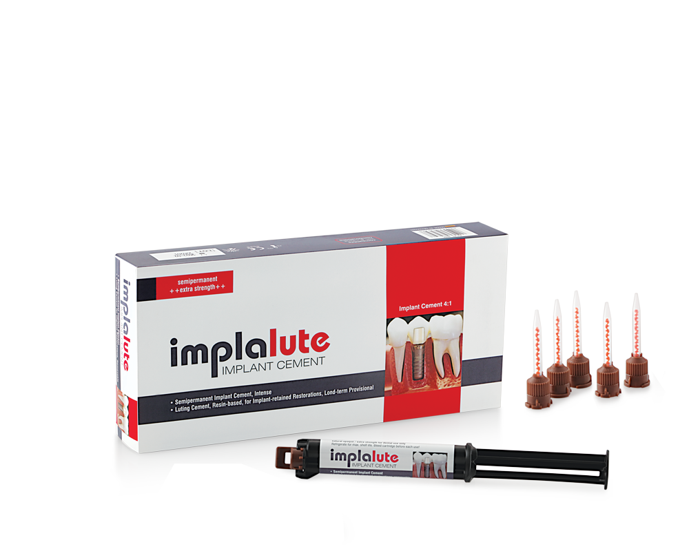 lmplalute is a cement for superstructures on a resin base 4:1. Specially designed for semipermanent fixing on customised abutments, abutments with reduced adhesion surface or particularly small abutments. With reinforced adhesion and compressive strength. The restoration can still be removed without damage even after extended time in position. Accurate positioning with low displacement resistance and particularly low film thickness. Excess easily removed during the plastic phase. Compatible with all material combinations, dual curing system.