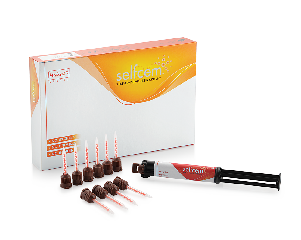 Selfcem Self-Adhesive Resin Cement is specifically designed to make the cementation of crowns, bridges, inlays, onlays and posts faster and easier by eliminating individual etching, priming, bonding, and mixing steps. Formulated with advanced resin technology, Selfcem Self-Adhesive Resin Cement provides the strongest retention available in a self-adhesive cement with the quick and easy to use auto-mix delivery system. Upon application, Selfcem Cement quickly goes to work to condition dentin, enamel, and the restoration all in one quick and simple step. By eliminating the etching, priming and bonding steps, both postoperative sensitivity and procedure time are drastically reduced improving peace of mind and freeing up precious chair time.