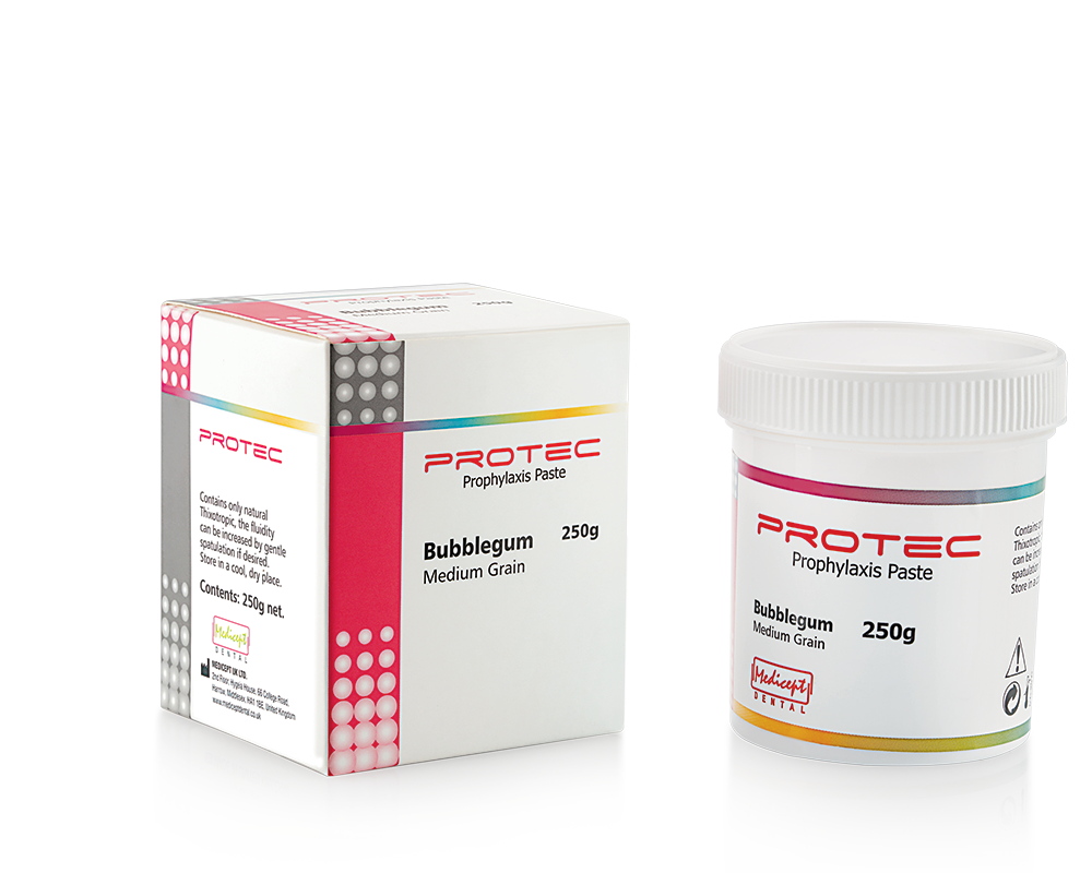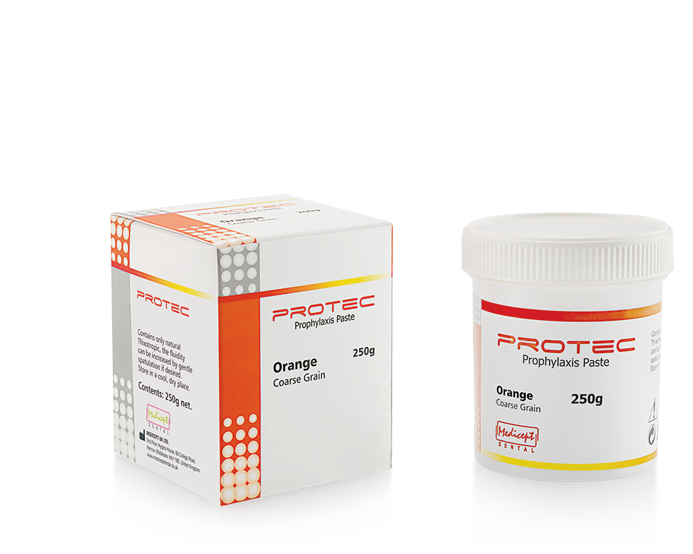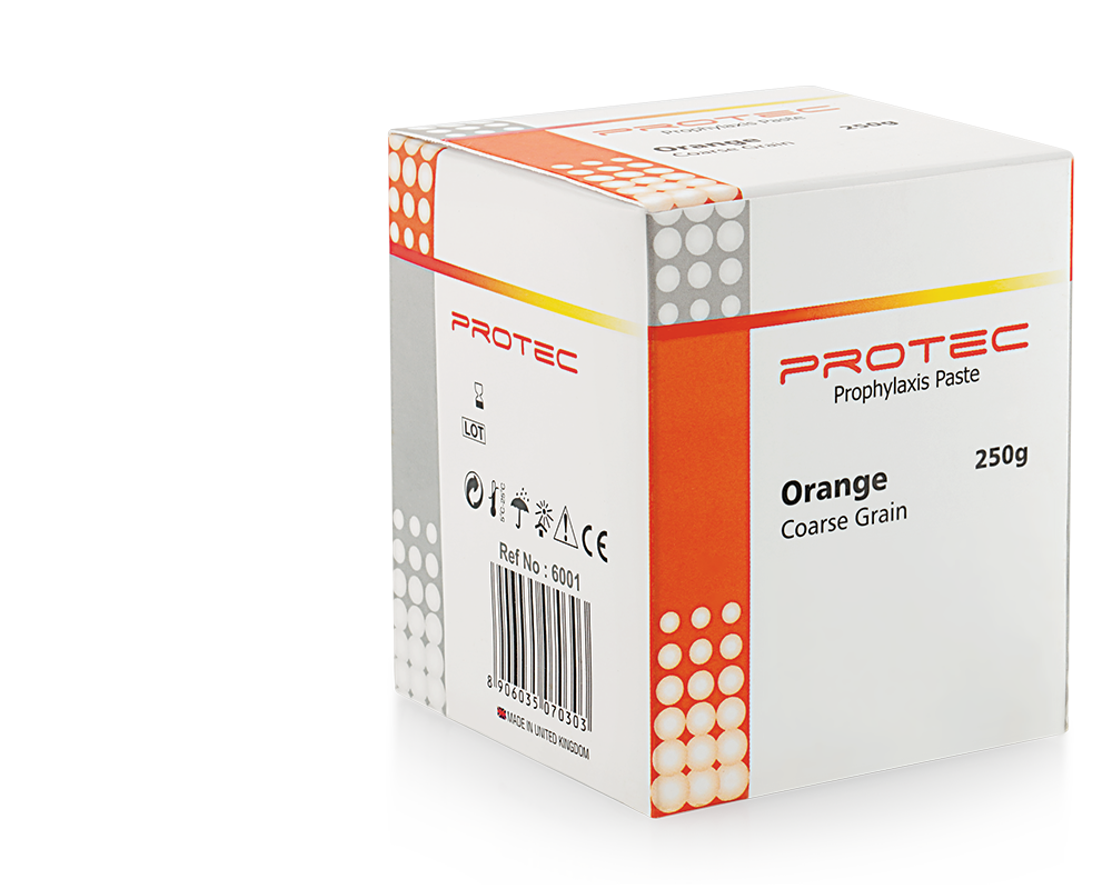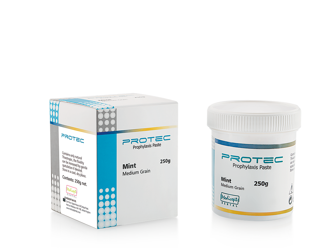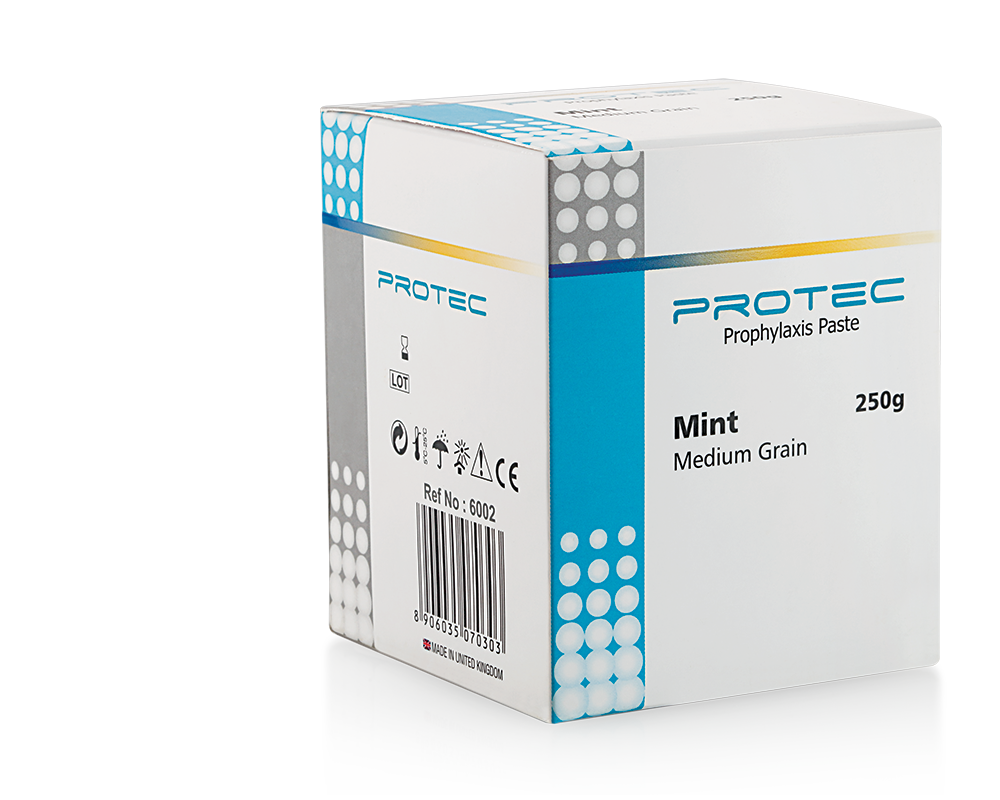 A selected blend of abrasives to ensure optimum removal of plaque and tartar without excessive abrasion to enamel. PROTEC regular prophypastes use a blend of abrasives selected to ensure optimum removal of plaque and tartar without any appreciable abrasion to enamel. The thixotropic properties of the paste are carefully controlled to ensure easy application without undesirable spattering at the rotation speeds required for prophylaxis. The regular prophypaste contains only natural flavourings, is fluoride free and is available in medium and course grades.