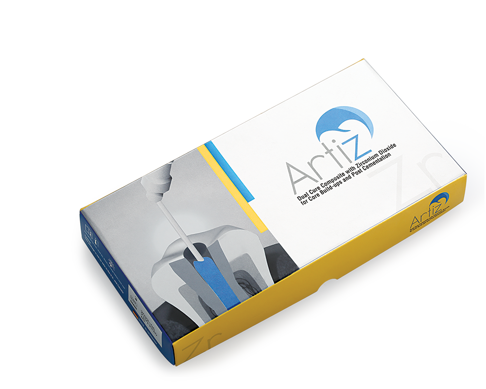 ARTIZ is a dual curing radiopaque flowable hybrid composite based material for core-build-up and cementation of posts. Delivered in auto-mixing 1:1 MiniMix Syringe it can be applied directly. ARTIZ exhibits a short setting time without high heat generation. The dual cure properties enables the dentist, also to carry out cementations and core build-ups in cases where alight cure cannot be guaranteed to be sufficient.