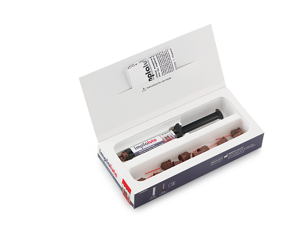lmplalute is a cement for superstructures on a resin base 4:1. Specially designed for semipermanent fixing on customised abutments, abutments with reduced adhesion surface or particularly small abutments. With reinforced adhesion and compressive strength. The restoration can still be removed without damage even after extended time in position. Accurate positioning with low displacement resistance and particularly low film thickness. Excess easily removed during the plastic phase. Compatible with all material combinations, dual curing system.