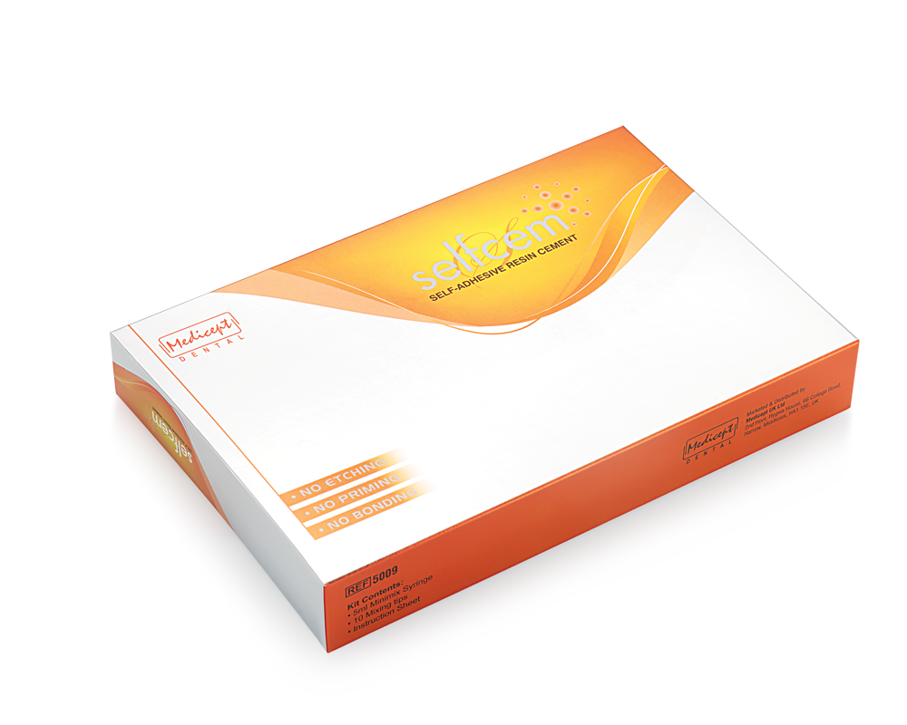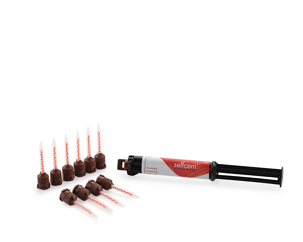 Selfcem Self-Adhesive Resin Cement is specifically designed to make the cementation of crowns, bridges, inlays, onlays and posts faster and easier by eliminating individual etching, priming, bonding, and mixing steps. Formulated with advanced resin technology, Selfcem Self-Adhesive Resin Cement provides the strongest retention available in a self-adhesive cement with the quick and easy to use auto-mix delivery system. Upon application, Selfcem Cement quickly goes to work to condition dentin, enamel, and the restoration all in one quick and simple step. By eliminating the etching, priming and bonding steps, both postoperative sensitivity and procedure time are drastically reduced improving peace of mind and freeing up precious chair time.