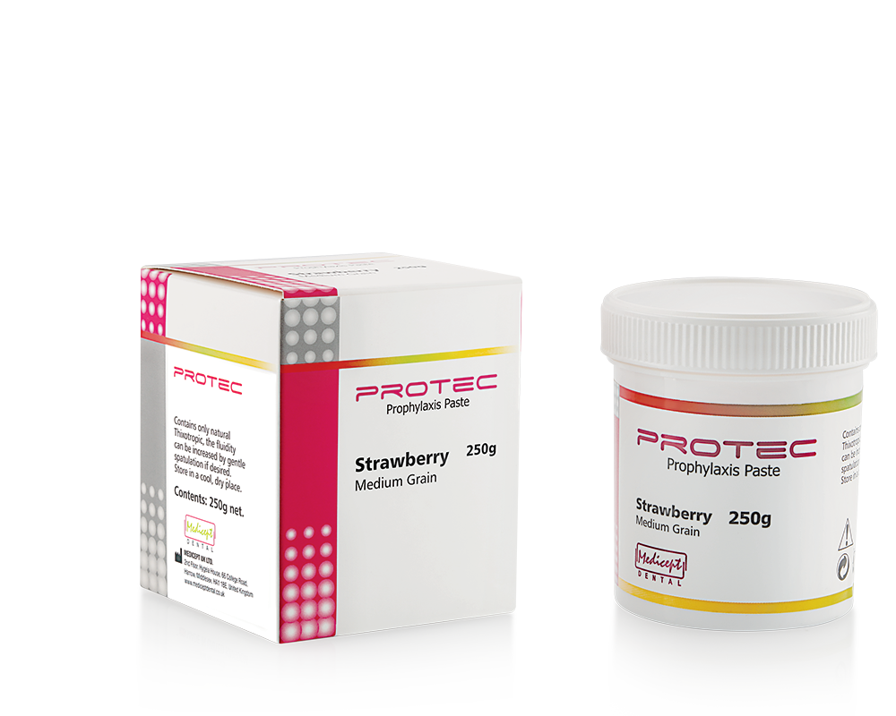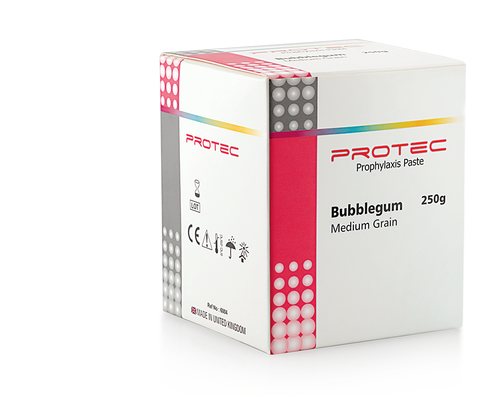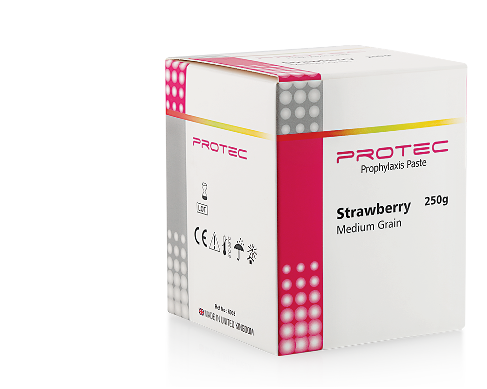 A selected blend of abrasives to ensure optimum removal of plaque and tartar without excessive abrasion to enamel. PROTEC regular prophypastes use a blend of abrasives selected to ensure optimum removal of plaque and tartar without any appreciable abrasion to enamel. The thixotropic properties of the paste are carefully controlled to ensure easy application without undesirable spattering at the rotation speeds required for prophylaxis. The regular prophypaste contains only natural flavourings, is fluoride free and is available in medium and course grades.