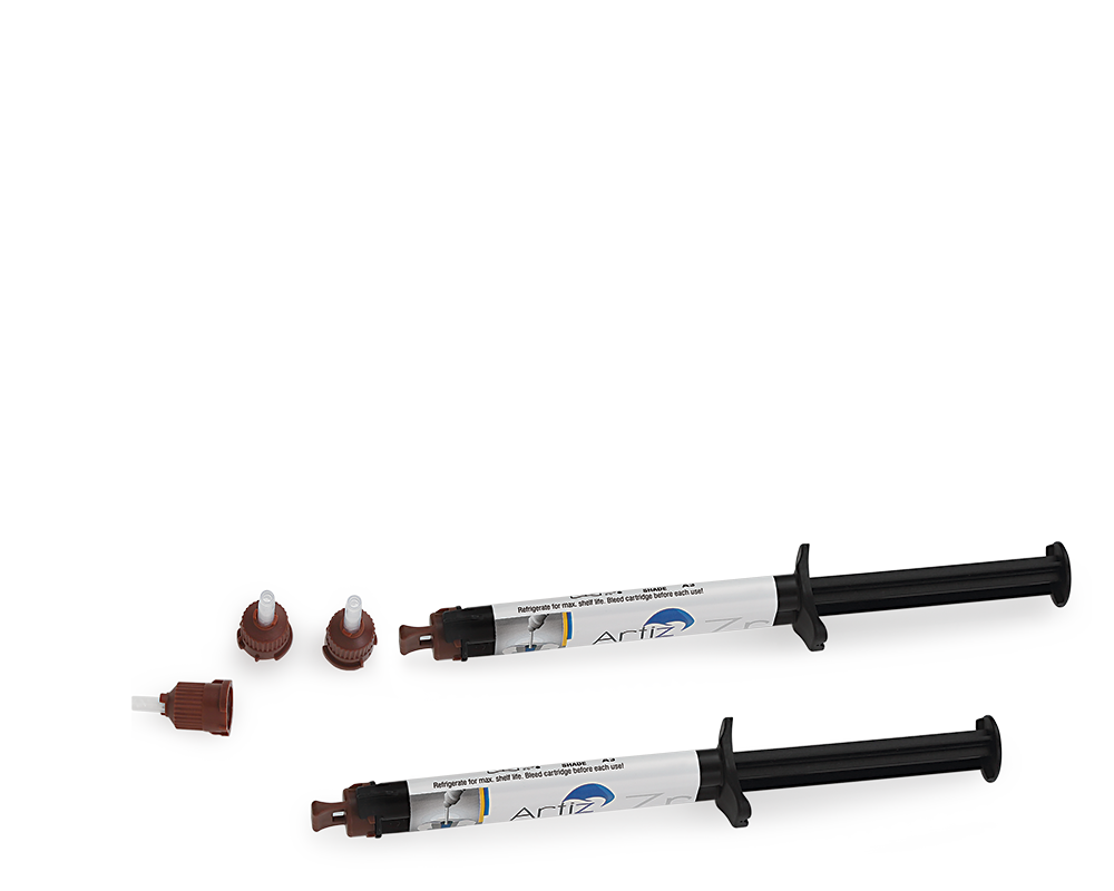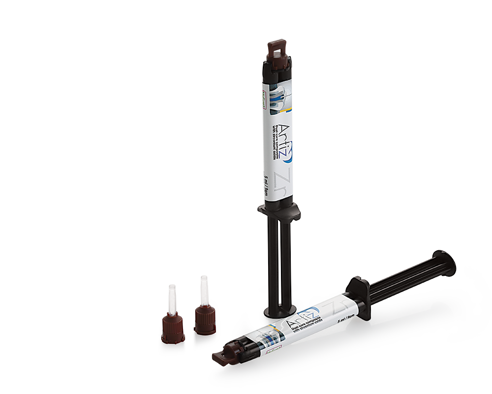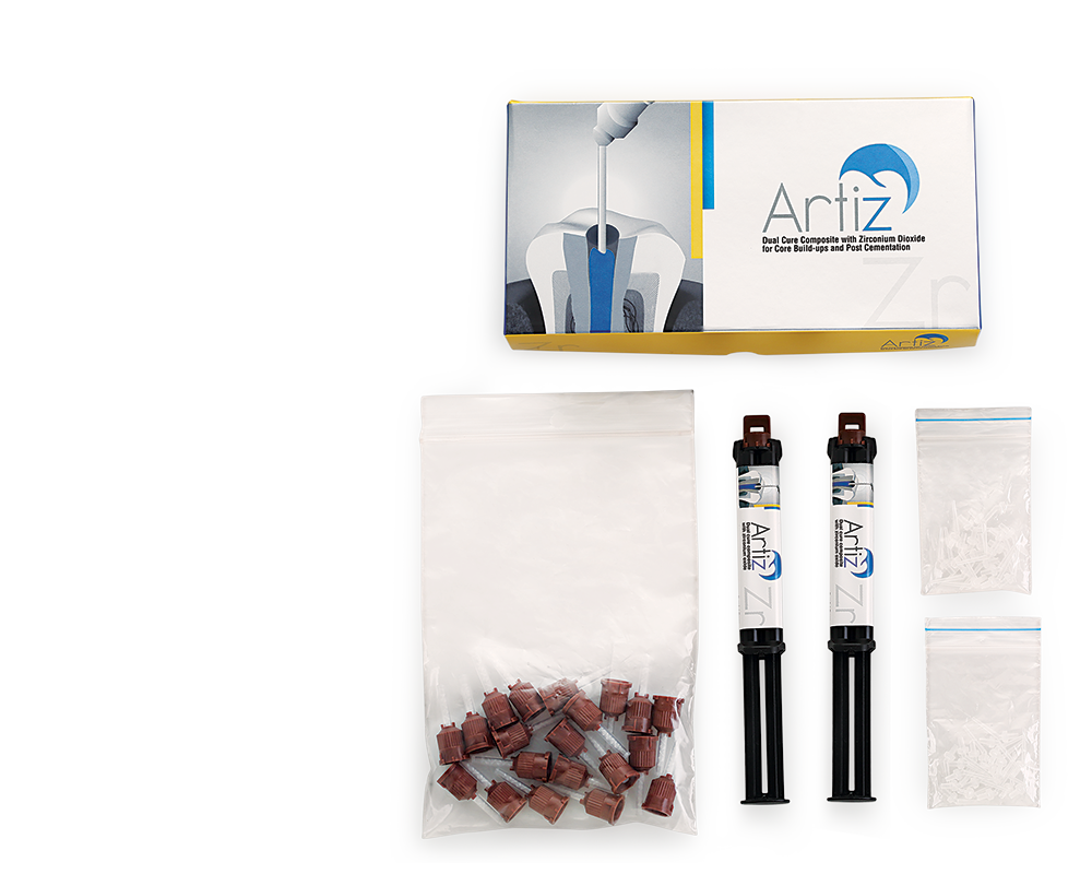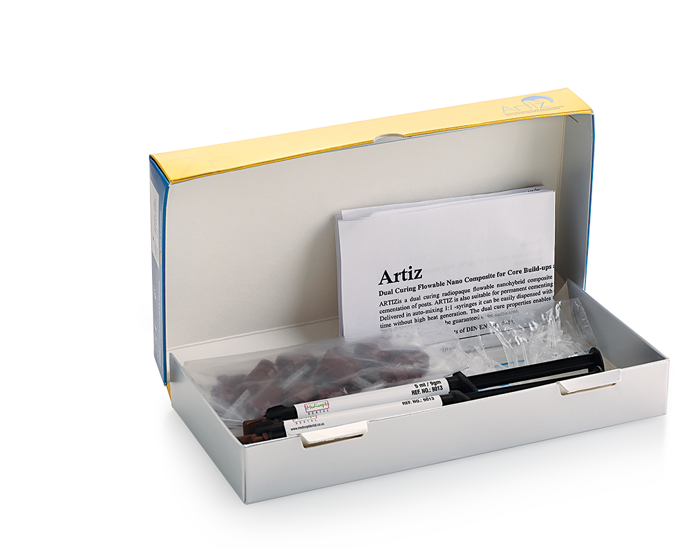 ARTIZ is a dual curing radiopaque flowable hybrid composite based material for core-build-up and cementation of posts. Delivered in auto-mixing 1:1 MiniMix Syringe it can be applied directly. ARTIZ exhibits a short setting time without high heat generation. The dual cure properties enables the dentist, also to carry out cementations and core build-ups in cases where alight cure cannot be guaranteed to be sufficient.